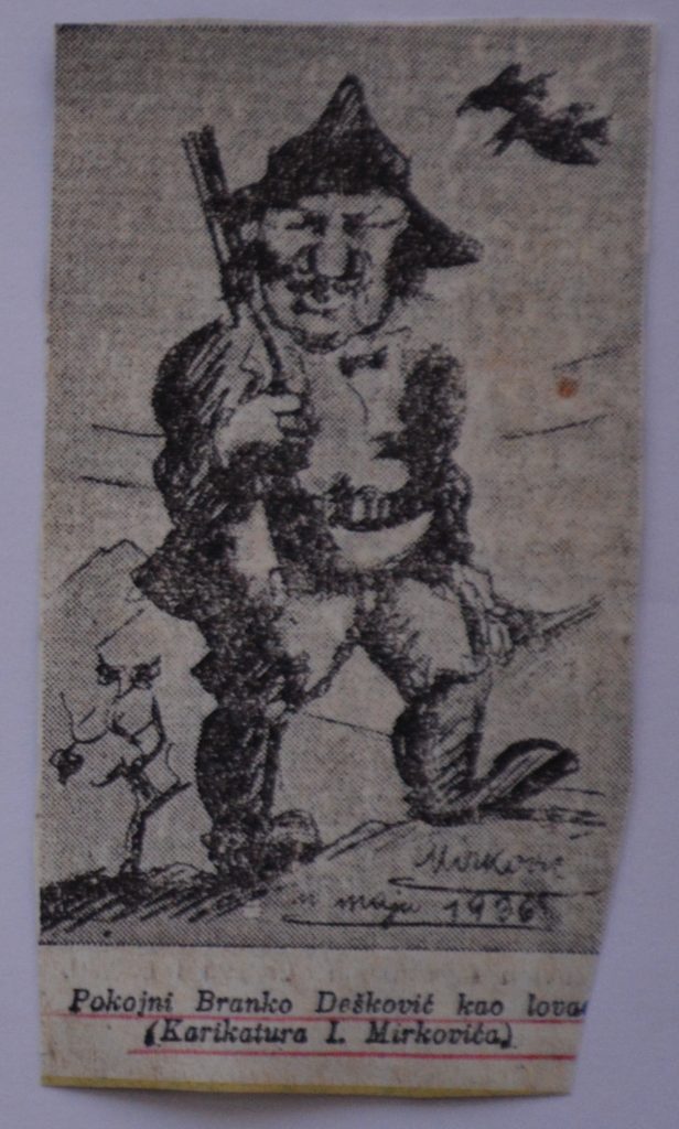 Sve s odigravalo, ovaj razgovor , u nazočnosti više osoba iz bračkog kulturnog života, 1936. godine , dakle pred punih 90 godina. U svibnju 1936. godine slikar I. Mirković prikazao je Deškovića kao lovca u karikaturi, što je također prilog proučavanju lovačke, životne i kiparske povijesti velikog kiparskog meštra , lovca i prijatelja lovačkih pasa i konja , najvećeg, do danas nedostižnog hrvatskog animaliste Branislava Deškovića.