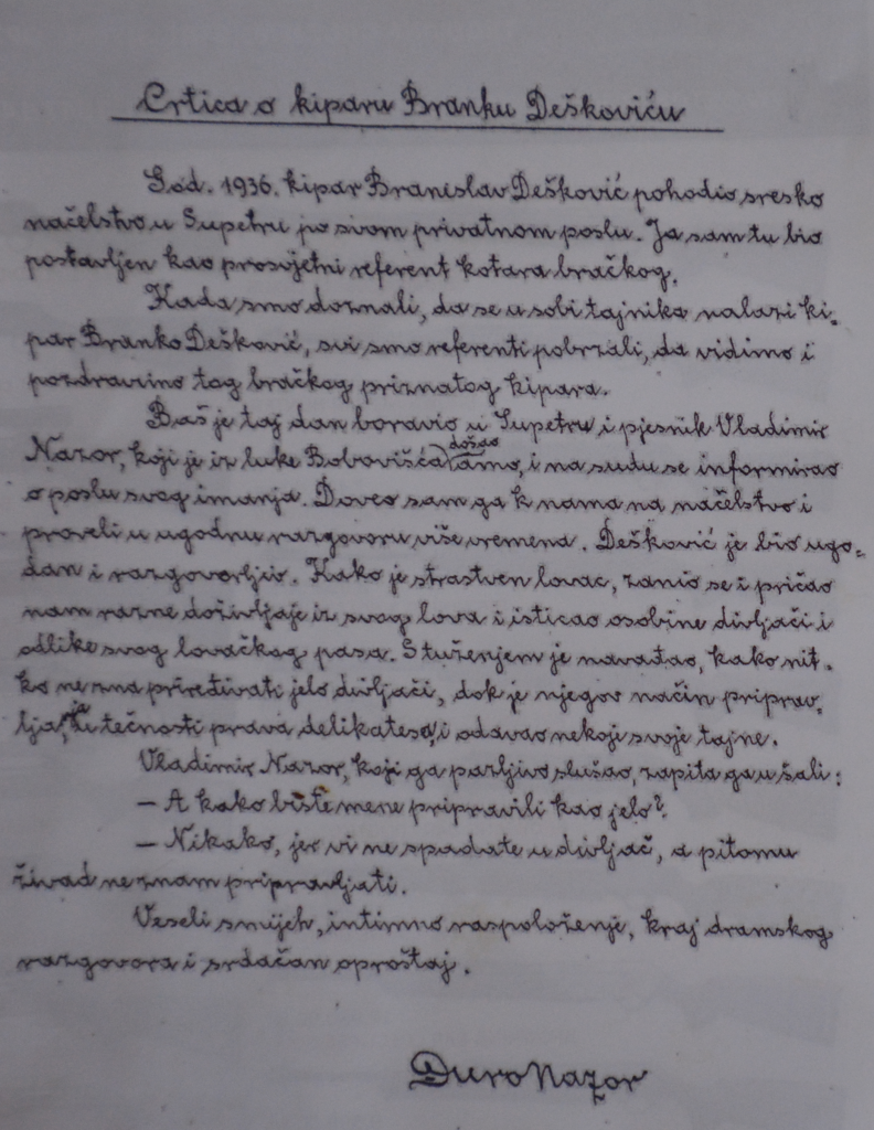 Do sada se , inače, uopće nije znalo da je Dešković volio kuhati i pripremati divljač „na brački „,dok nije pronađen kratki zapis rečenog Đure Nazora. A zamislite da se jednog dana pronađe i njegov, možda, kuharski dnevnik, sa bračkim receptima o spravljanju lovne divljači!