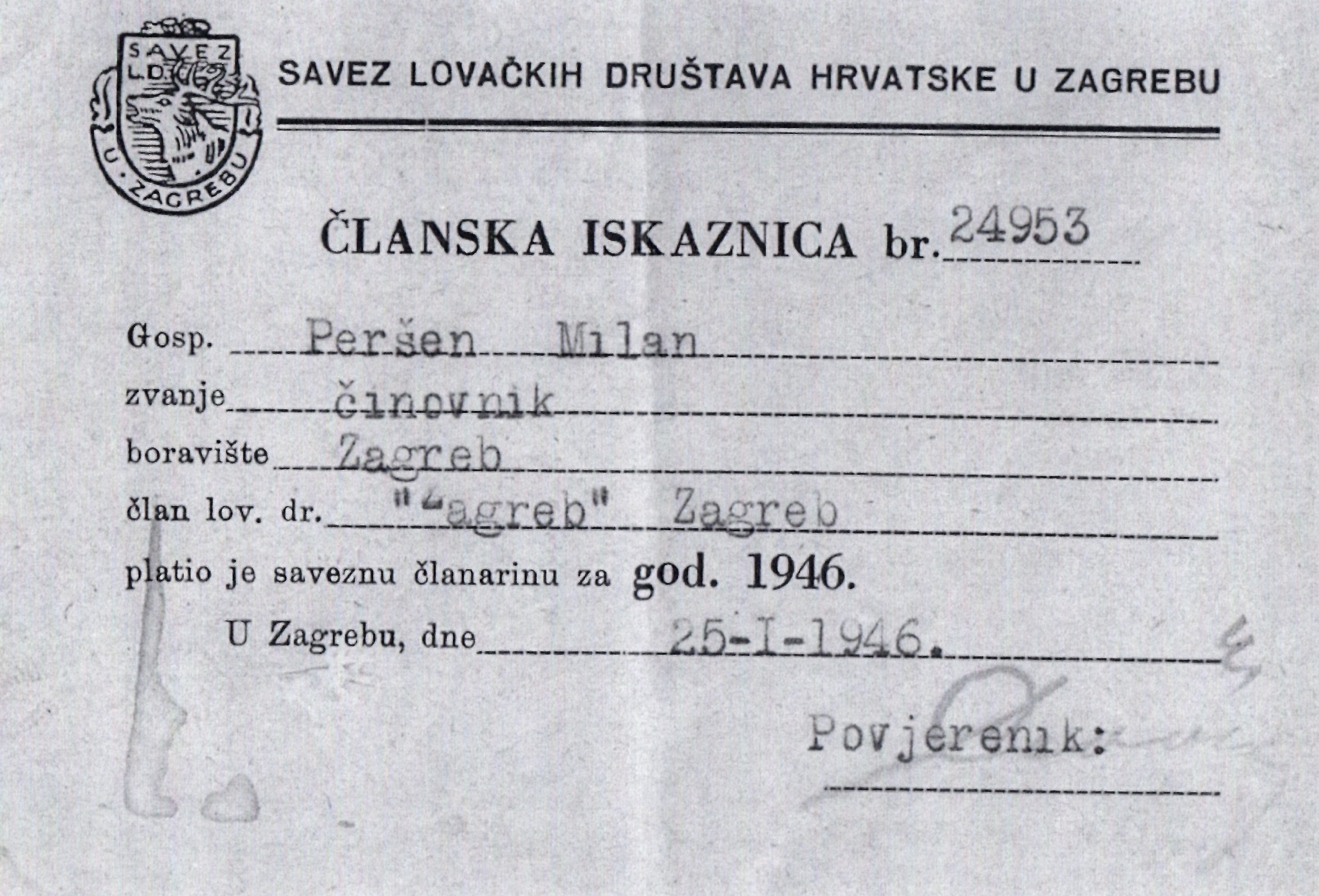 Pregledavajući staru lovačku dokumentaciju zaostalu iz jednog vremenskog razdoblja – naišli smo na sačuvanu člansku iskaznicu broj 24953 na ime činovnika Milana Peršena.